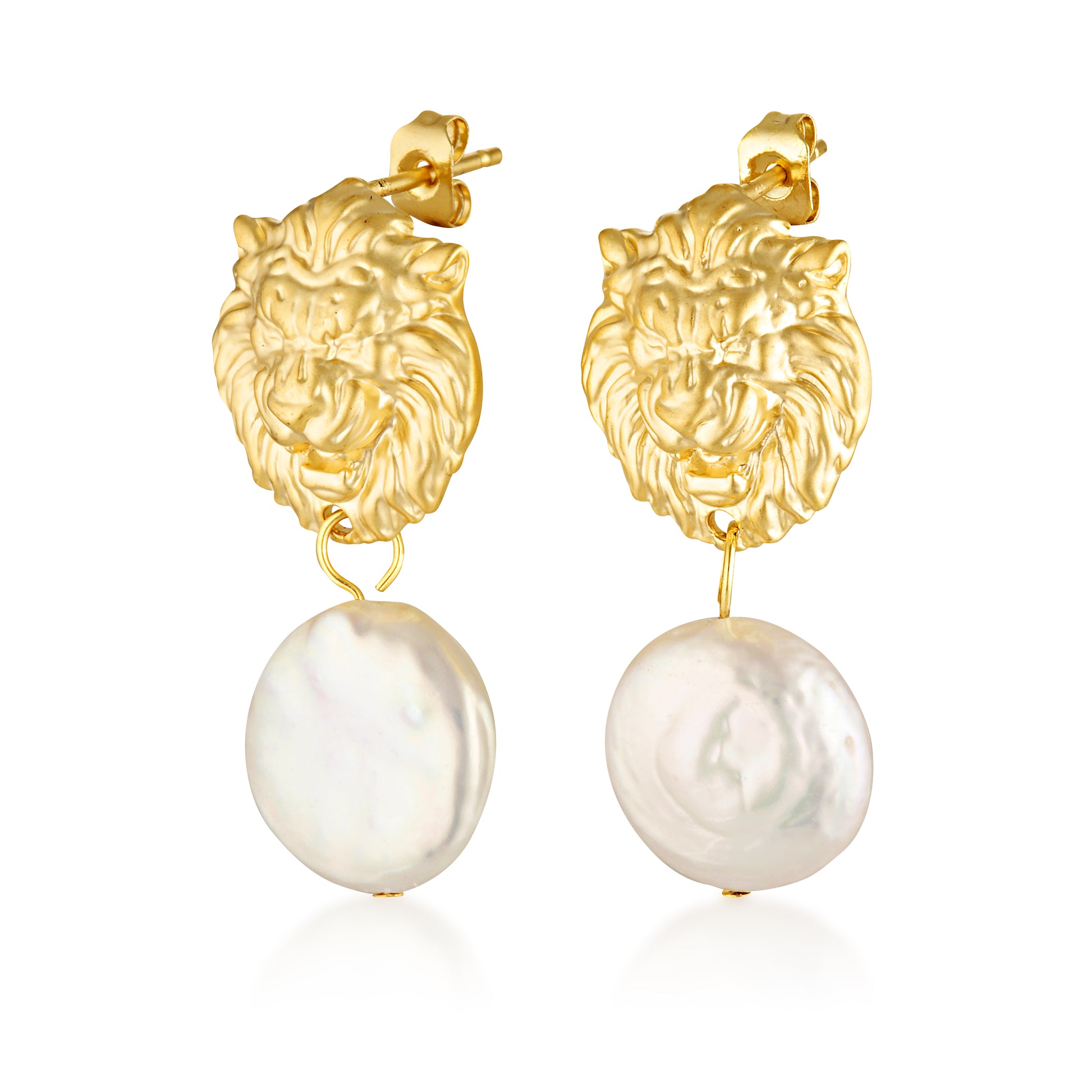 In Like Finn Narnia Earrings are 18K Gold Plated Studs that feature a gold lion's head, adorned with a genuine Keshi Pearl. Designed for those wanting to make a statement, they are long lasting, water resistant and perfect for everyday wear.