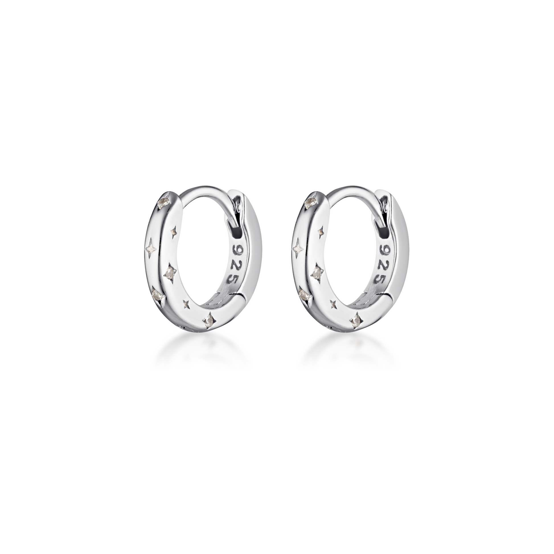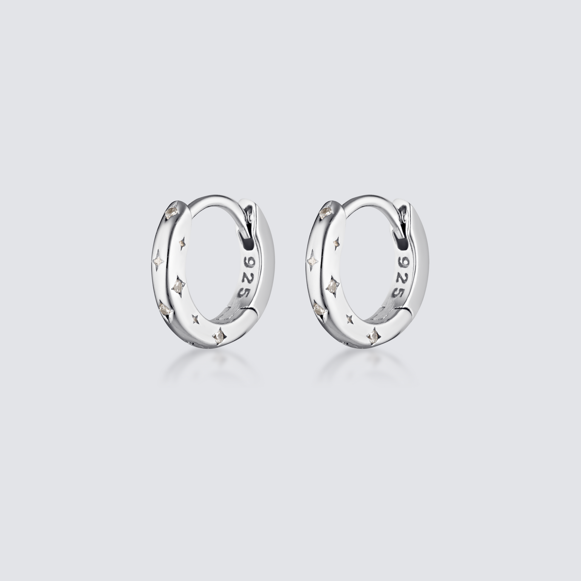 In Like Finn Stardust Huggies in Silver are 925 Sterling Silver Stud Huggies with Zircon Stones for pierced ears. They are long lasting, waterproof and perfect for everyday wear.
